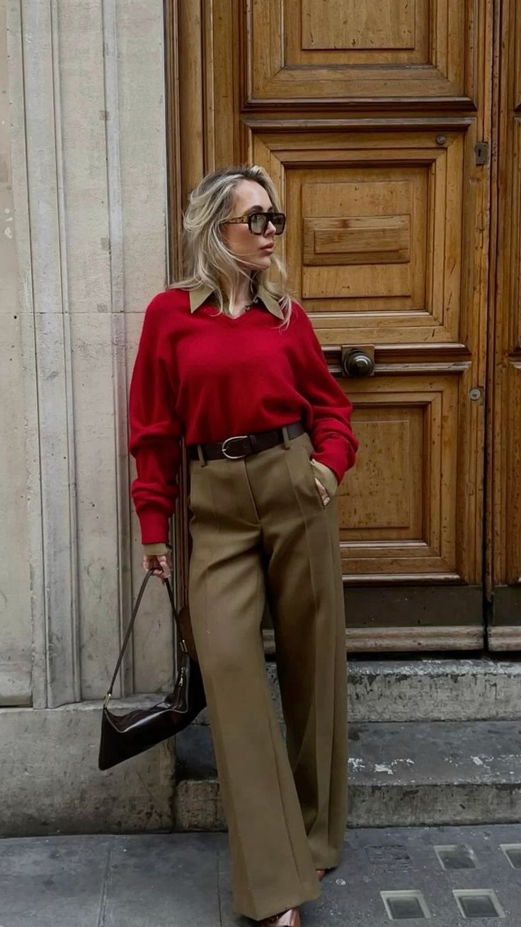 For example, beige trousers with a bright red sweater, or a gray outfit with cobalt shoes. The neutral base keeps the look grounded, while the bright piece becomes the focal point.
