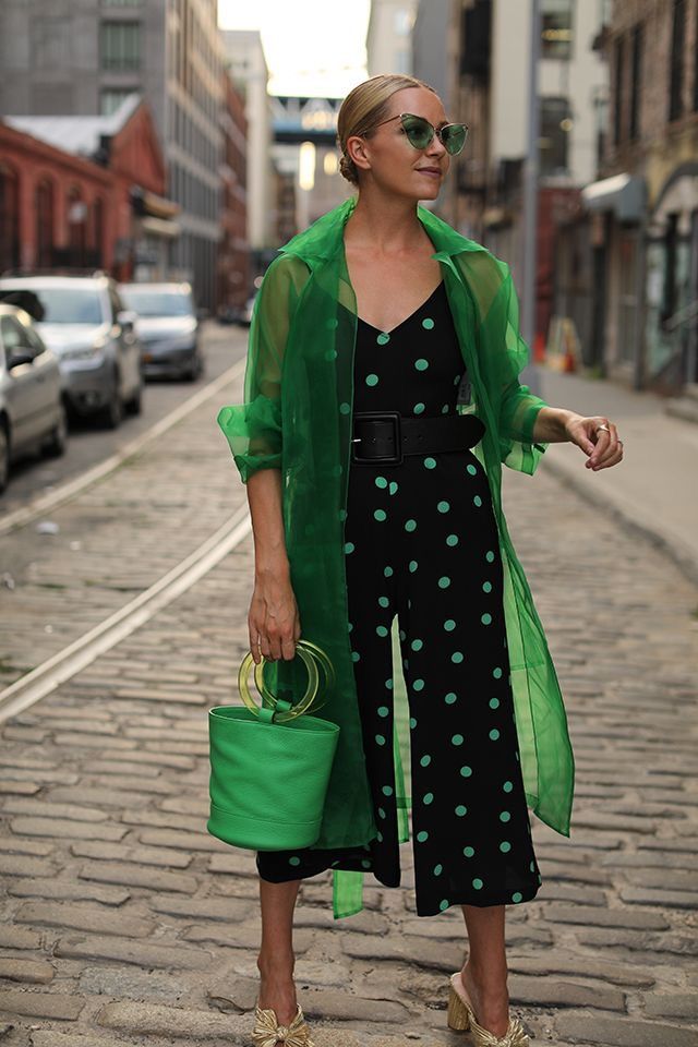 This jumpsuit has green dots, so pairing some green accessories or adding a green layer piece was a perfect decision.
